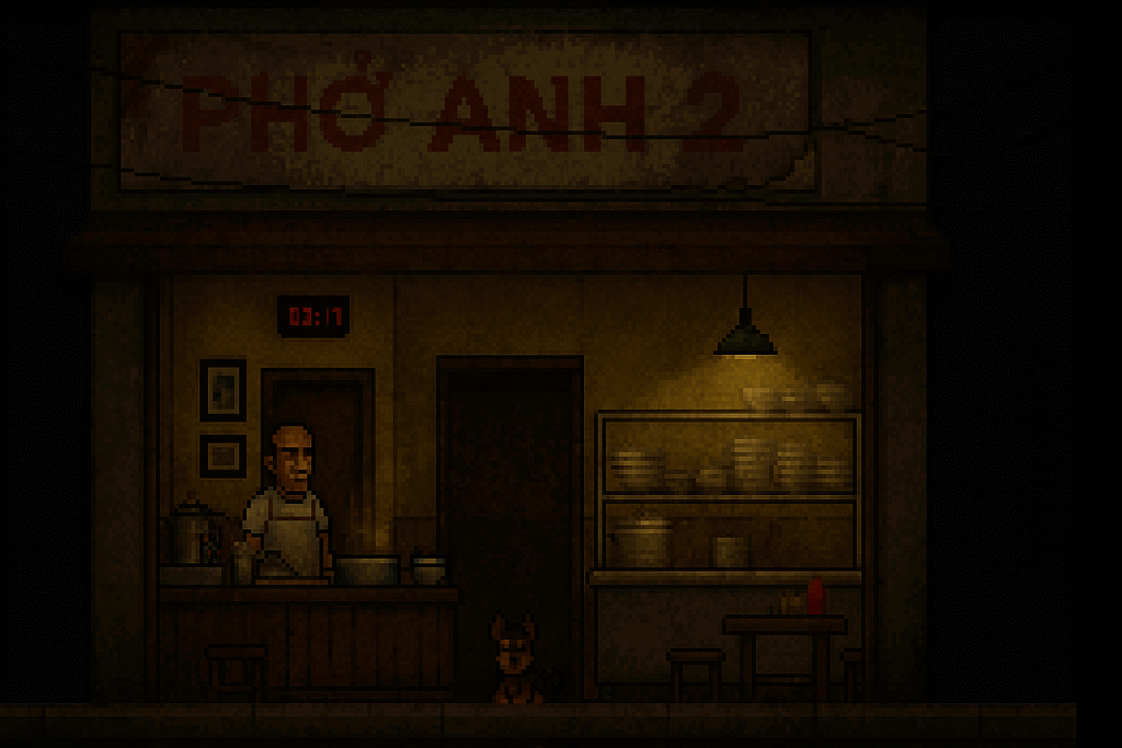 You open the shop, prep ingredients, and serve customers. Everything feels ordinary: the sound of slicing beef, boiling broth, and the dog barking outside. But then, a customer asks for pho without broth. A wall clock is stuck at 3:17 AM. Cįŗu VĆ ng keeps staring into the dark corner of the kitchen.