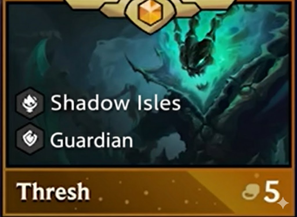Thresh is a powerful control-oriented 5-cost champion who traps enemies inside a Soul Prison, deals continuous AoE magic damage, and forcibly pulls enemies into The Box. His combination of sustained damage, crowd control, and forced repositioning makes him a disruptive frontline utility unit.